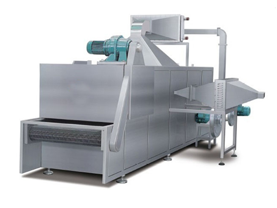 物料由加料器均匀地铺在网带上,网带采用12-60目不锈钢丝网。由传动装置拖动在网带式干燥机内移动。网带式干燥机由若干单元组成,每一单元热风独立循环,部分尾气由专门排湿风机排出,废气由调节阀控制,热气由下往上或由上往下穿过铺在网带上的物料,加热干燥并带走水分。网带缓慢移动,运行速度可根据物料温度自由调节,干燥后的成品连续落入收料器中。上下循环单元根据用户需要可灵活配备,单元数量可根据需要选取。